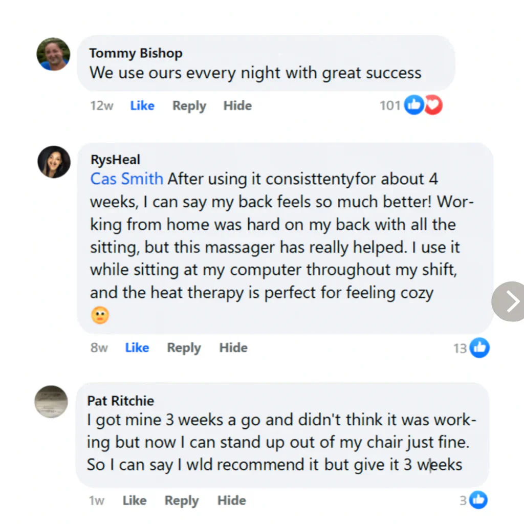reported reduced lower back stiffness and improved mobilityafter using the built-in heat + vibration combo, which helps boost blood flow and loosen tight muscles after long workdays.